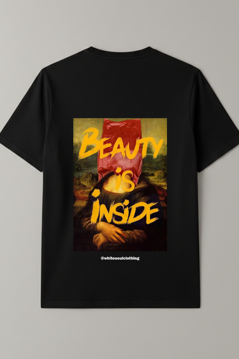 Αναβαθμίστε το street style σας με ένα t-shirt που συνδυάζει την κλασική τέχνη με το σύγχρονο κοινωνικό μήνυμα. Αυτό το t-shirt διαθέτει μια τολμηρή επανερμηνεία της Mona Lisa, με καλυμμένο πρόσωπο και το δυνατό μήνυμα "Beauty is Inside" σε έντονη γραμματοσειρά τύπου graffiti.
