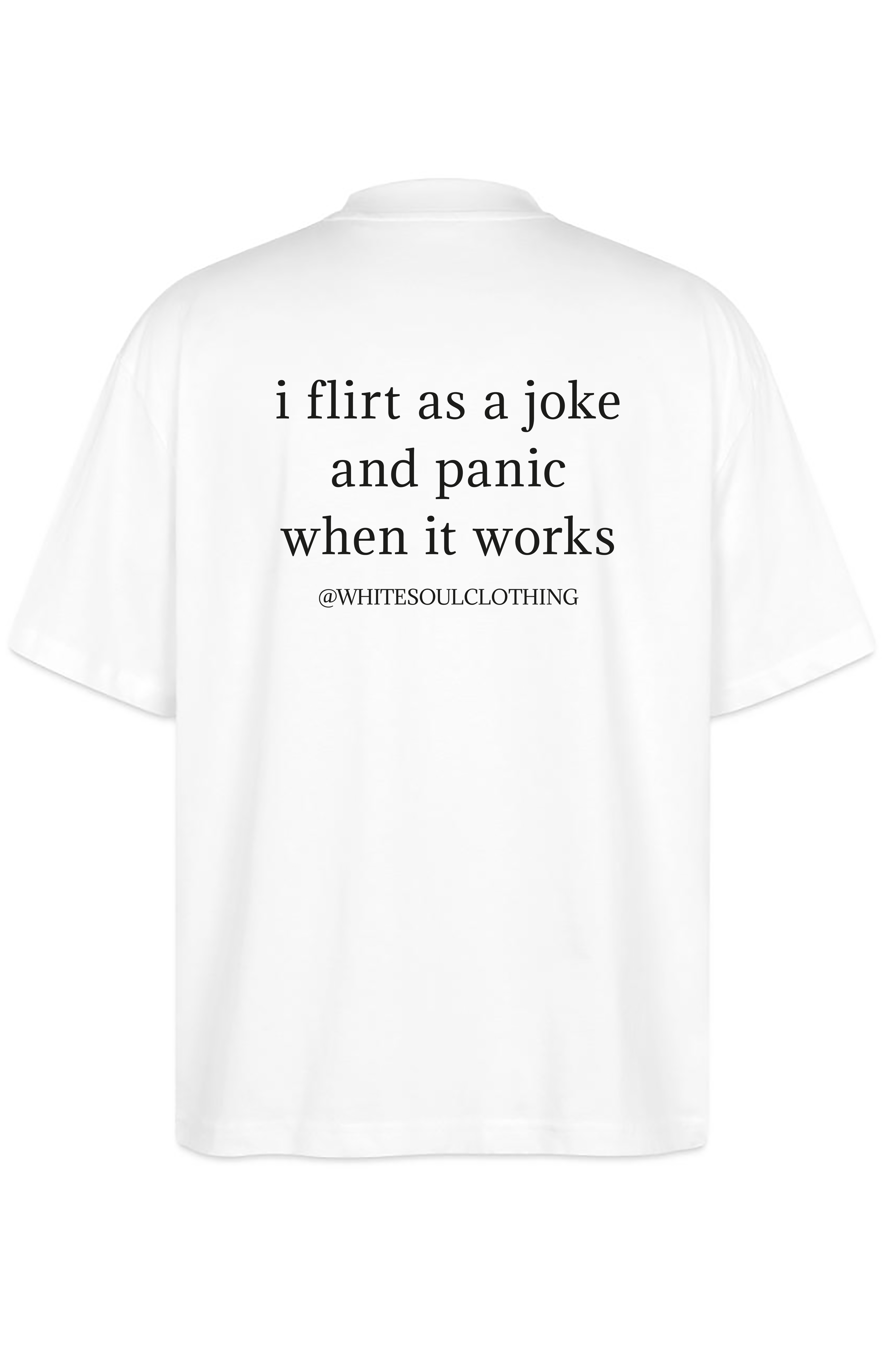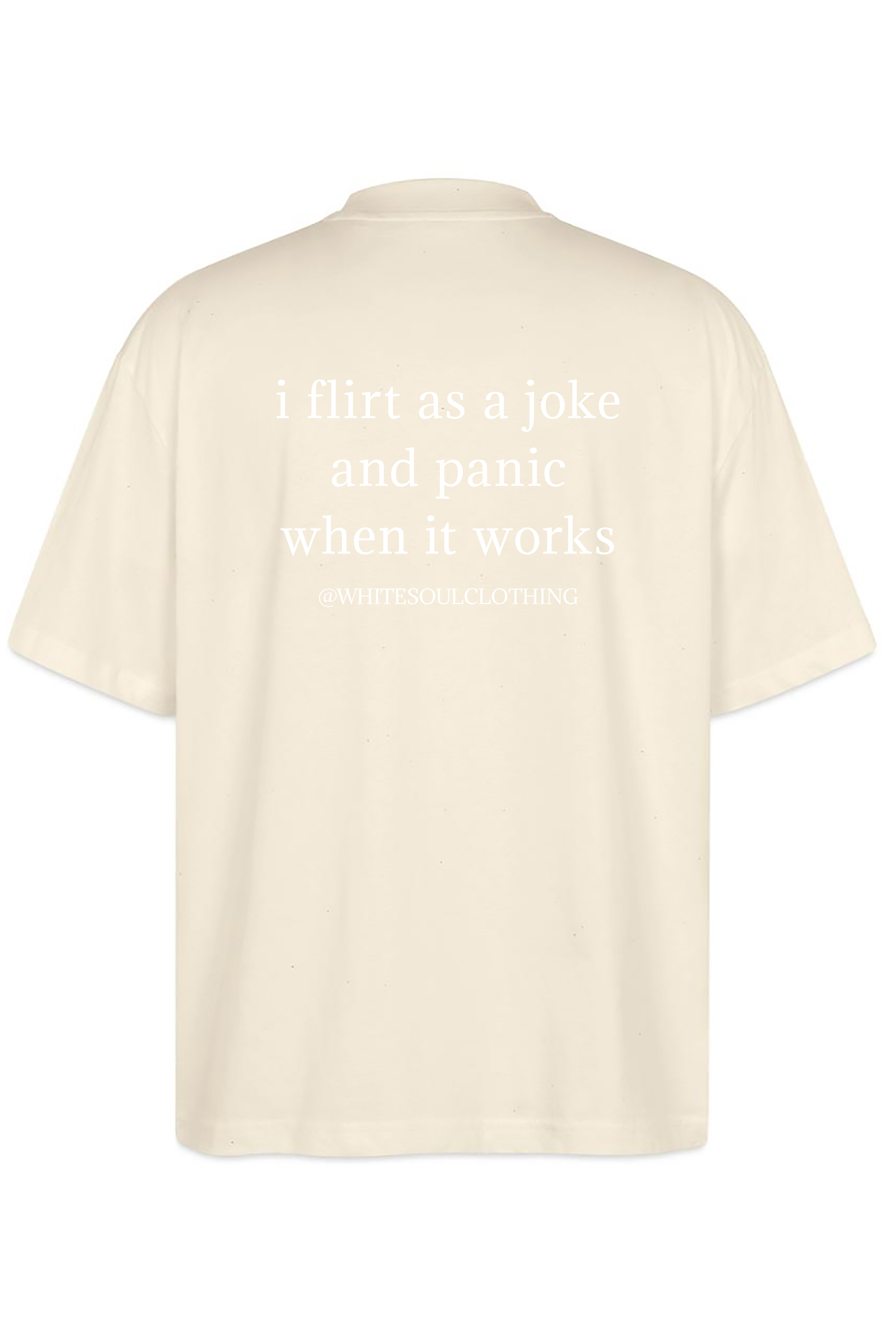 Το απόλυτο "relatable" κομμάτι για όσους το παίζουν cool μέχρι να... σοβαρέψουν τα πράγματα! Το oversize tee "I flirt as a joke and panic when it works" είναι η στολή για τους social gamblers που έχουν περισσότερο θάρρος στις ατάκες παρά στην πράξη. Ένα tee γεμάτο χιούμορ και αυτοσαρκασμό που θα κάνει τους πάντες γύρω σου να ταυτιστούν αμέσως.