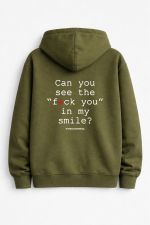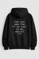 Smile sweet fuck you inside. Unisex urban zip up hoodie με quotes και στάμπα για outfit που λέει άλλα απ’ όσα δείχνει.