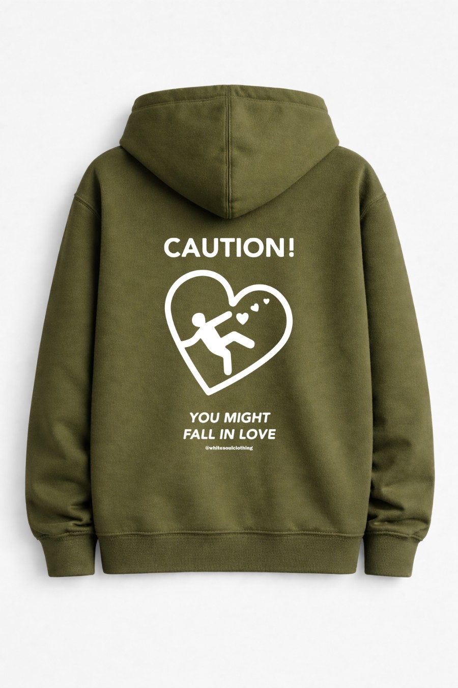 Caution you might fall in love. Unisex urban zip up hoodie με quotes και στάμπα για outfit που τραβάει χωρίς προειδοποίηση.